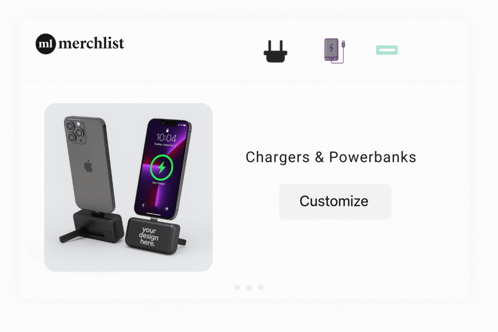 With Merchlist, designing custom chargers and powerbanks is effortless, modern, and functional. Perfect for corporate gifting, promotional events, tech merchandise, or employee kits — our range of personalized powerbanks and chargers keeps your brand charged up and visible. Choose from stylish, high-quality options and add your logo, message, or design for a sleek branded finish.