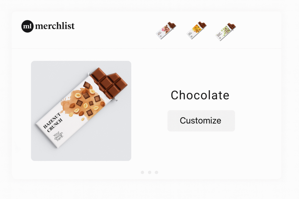 Log in to your Merchlist account, select your chocolate type, upload your logo or message, and preview your product before checkout.
