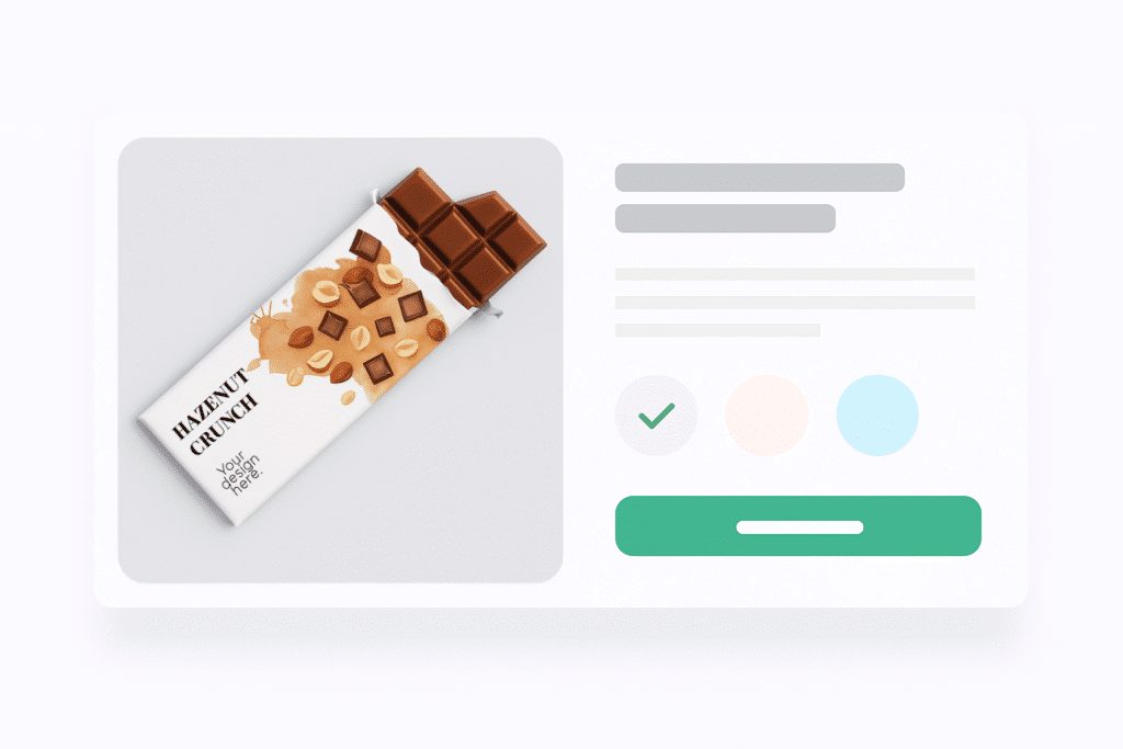 Upload your logo or artwork, select your chocolate type and packaging, and preview your design before ordering.