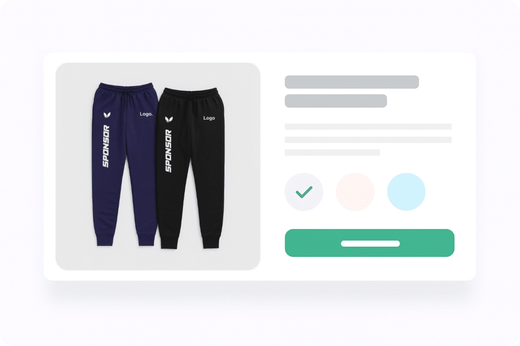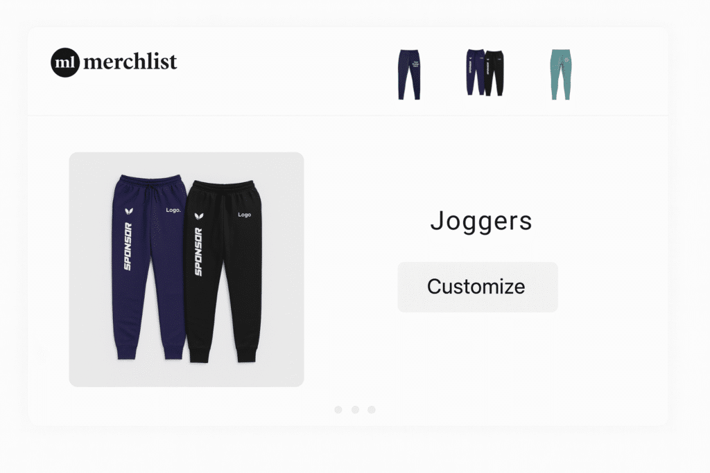 Log in to your Merchlist account, select your jogger style, upload your design or logo, and preview your product before checkout.
