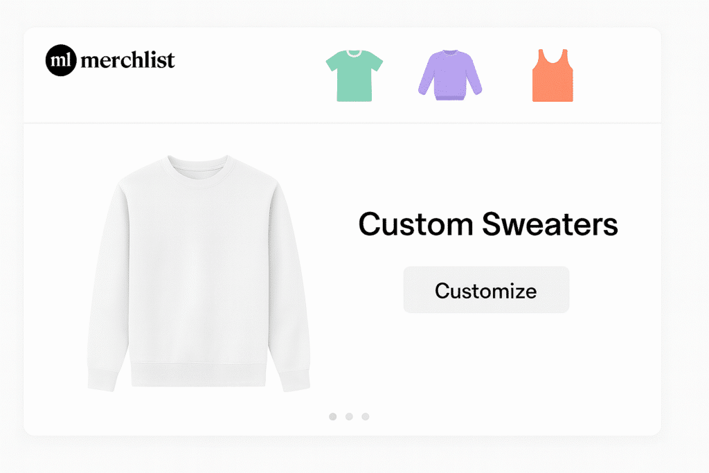 Log in to your Merchlist account, select your sweater style, upload your design or logo, and preview your product before checkout.