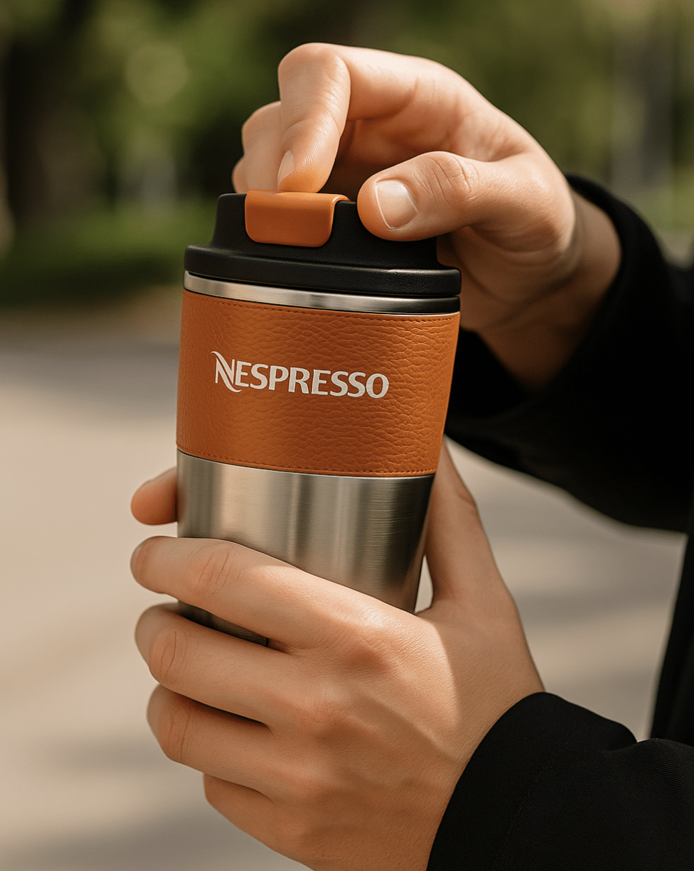 Elevate your beverage experience with the Custom Branded COZY Leather Tumbler by Merchlist. It is a premium double-wall stainless steel tumbler designed to combine sophistication, performance, and sustainability. This 420ml insulated mug is perfect for both hot and cold beverages. It maintains the ideal temperature for hours while showcasing a sleek, leather-textured exterior that exudes class and professionalism.