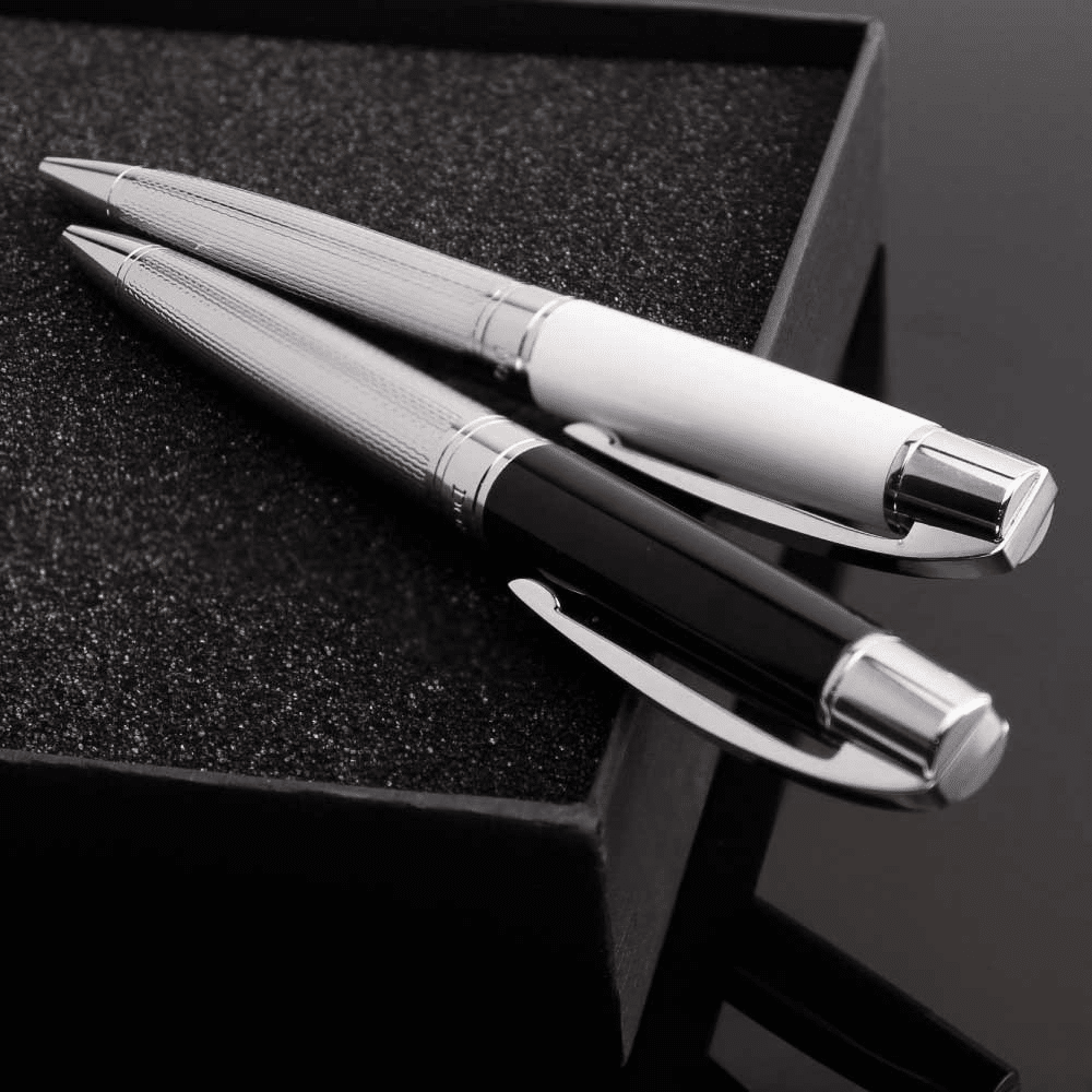 Moreover, the chrome clip and silver accents add a touch of modern refinement. Available in glossy black or white finishes, the pen’s sleek design complements any professional setting. From boardrooms and conferences to networking events and corporate functions, it is a suitable choice.
