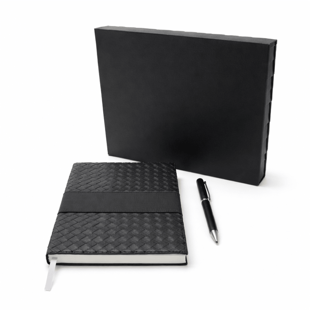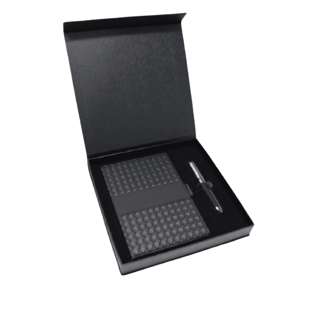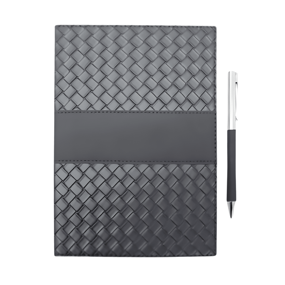 Paired with a matching black ink pen, this set embodies refined minimalism. The pen’s metallic detailing and ergonomic feel make it as stylish as it is functional. It is ideal for executives, business meetings, or daily note-taking. Together, the notebook and pen create a cohesive, premium presentation. This set perfectly represents your brand’s commitment to quality and excellence.