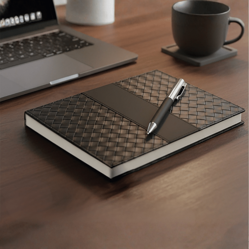 The Luxe A5 Notebook features a refined black textured PU leather cover with a distinctive woven pattern. This exudes understated luxury. The sleek black design is complemented by a customizable branding area. It is perfect for engraving, debossing, or UV printing your company logo, name, or personalized design.