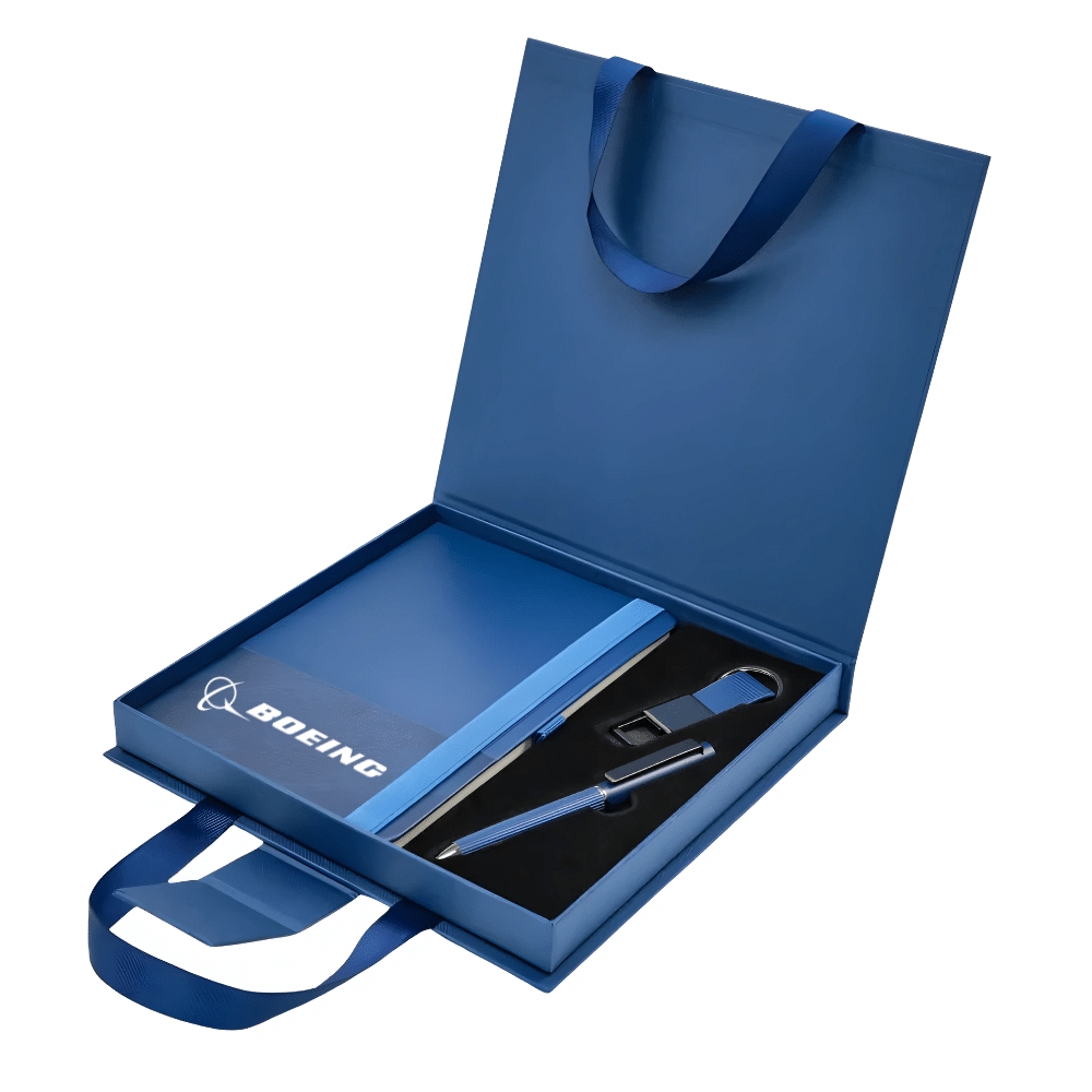This elegant 3-in-1 gift set includes a custom printed notebook, a personalized metal pen, and a custom branded keychain with your design or company logo. They are all beautifully presented in a luxury ribbon-handle gift box.