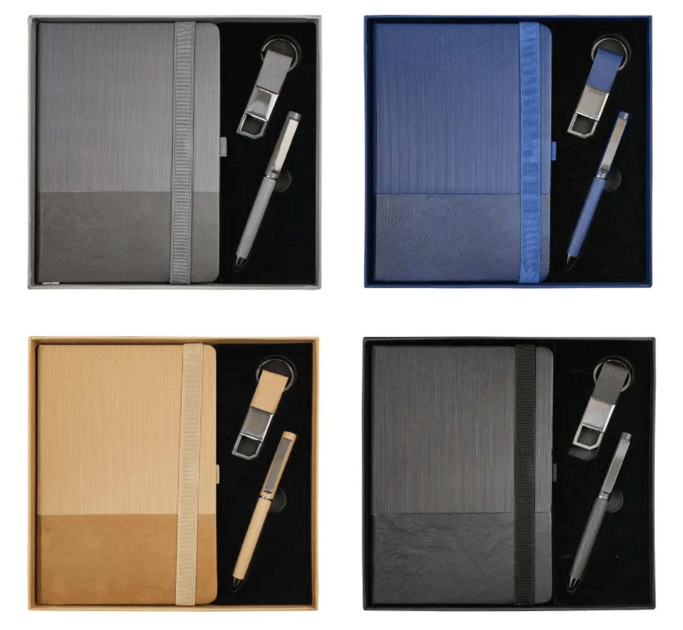 • Premium 3-in-1 Gift Set – Includes a lined PU notebook, sleek metal pen, and modern gunmetal keychain.