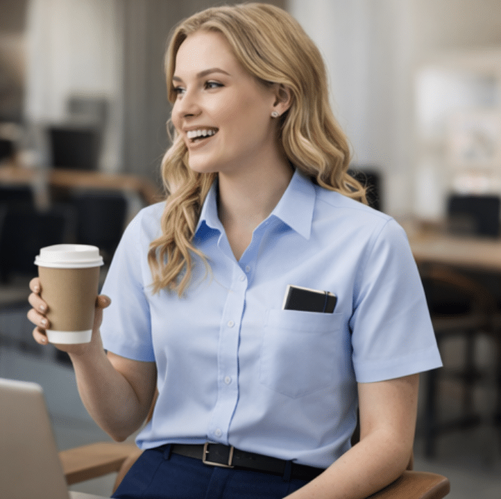 The premium fabric actively resists wrinkles during long work days. As a result, your front-office staff and daily commuters always look crisp and clean.