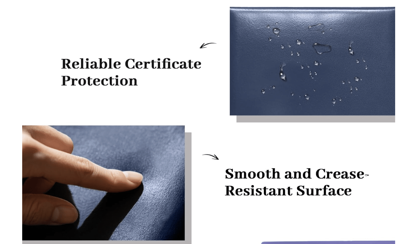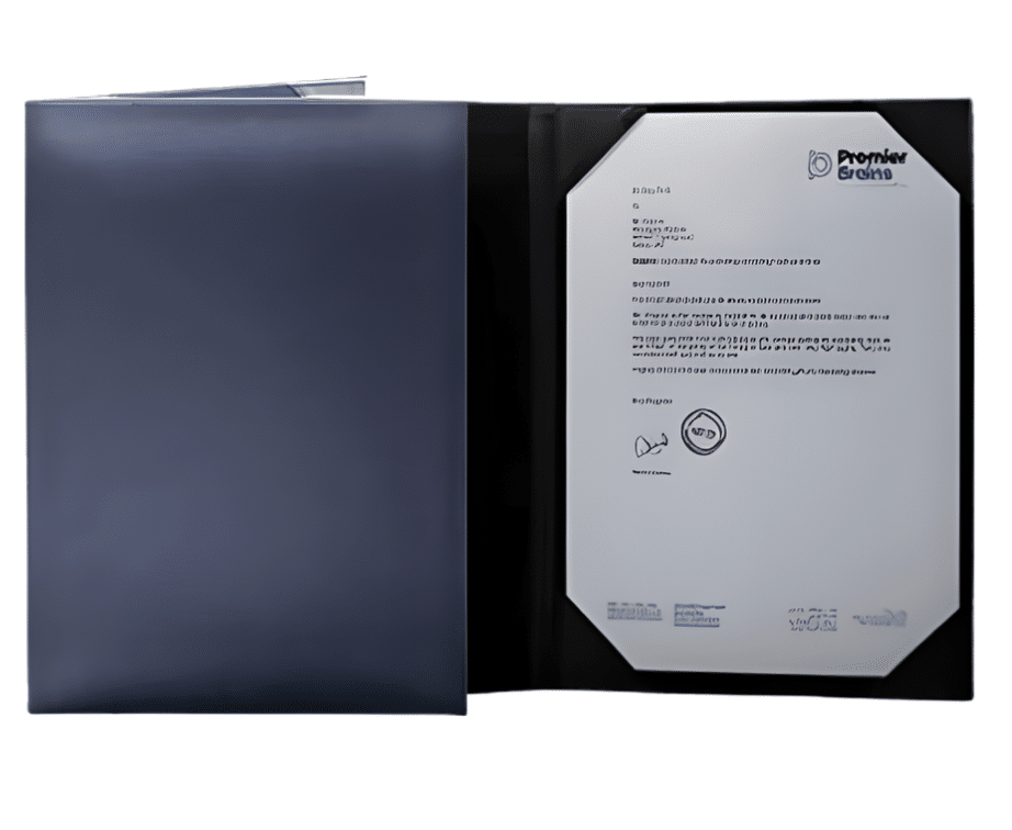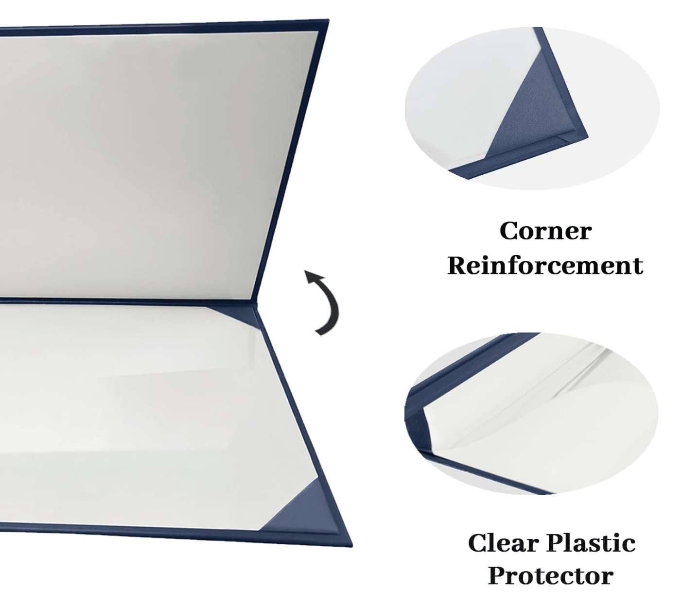 Made from high-quality leatherette, this folder features a soft foam interior, a textured exterior finish, and velvet lining on the inside. This gives it a refined and luxurious appeal. The durable leatherette material not only enhances the premium look. It also provides long-lasting resistance against scratches and scuffs. Thus, it ensures the folder retains its pristine appearance even after years of use.
