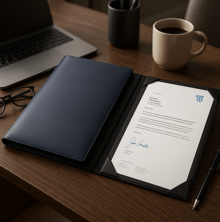 The Signature Document Folder is a statement of sophistication, professionalism, and purpose. It is crafted for those moments that truly matter. Designed to elevate every business signing, contract exchange, or corporate presentation, this premium custom branded document folder ensures that your documents are presented with the elegance and respect they deserve.