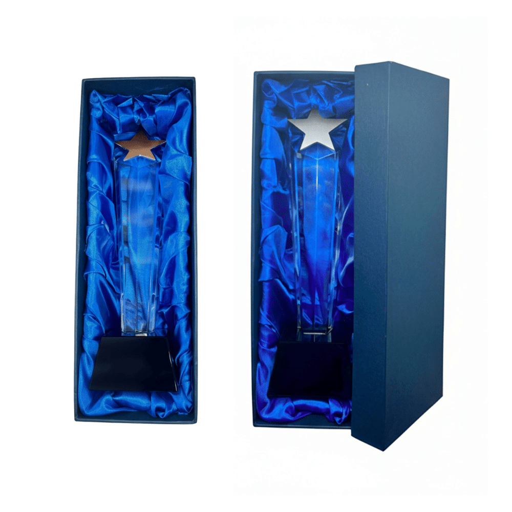 This elegant crystal award acts as a brilliant blank canvas for your most important messages. You can easily add your personalised text, custom printed design, or company logo to make it completely unique. We offer highly precise engraving right on the prominent metal star or the sleek black glass base.