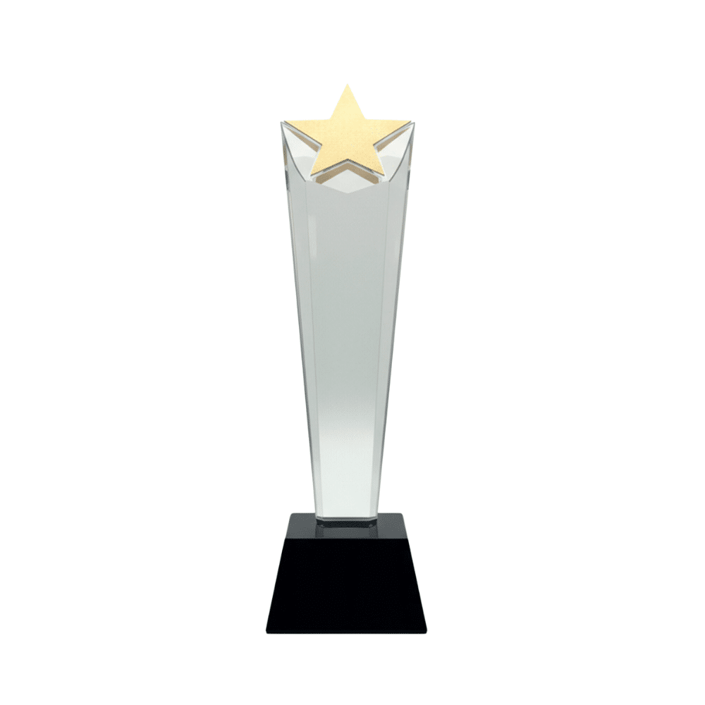 Celebrate true excellence with the Custom STELLAR Crystal Trophy with Metal Star by Merchlist. This modern and luxurious award perfectly captures the essence of success. Specifically, it features a faceted clear crystal body topped with a stunning radiant golden or silver star.