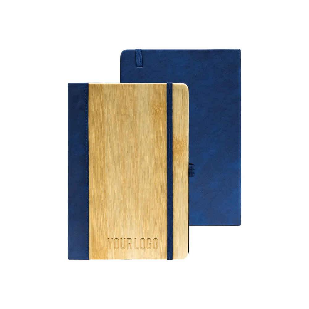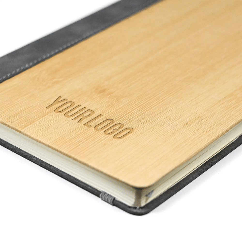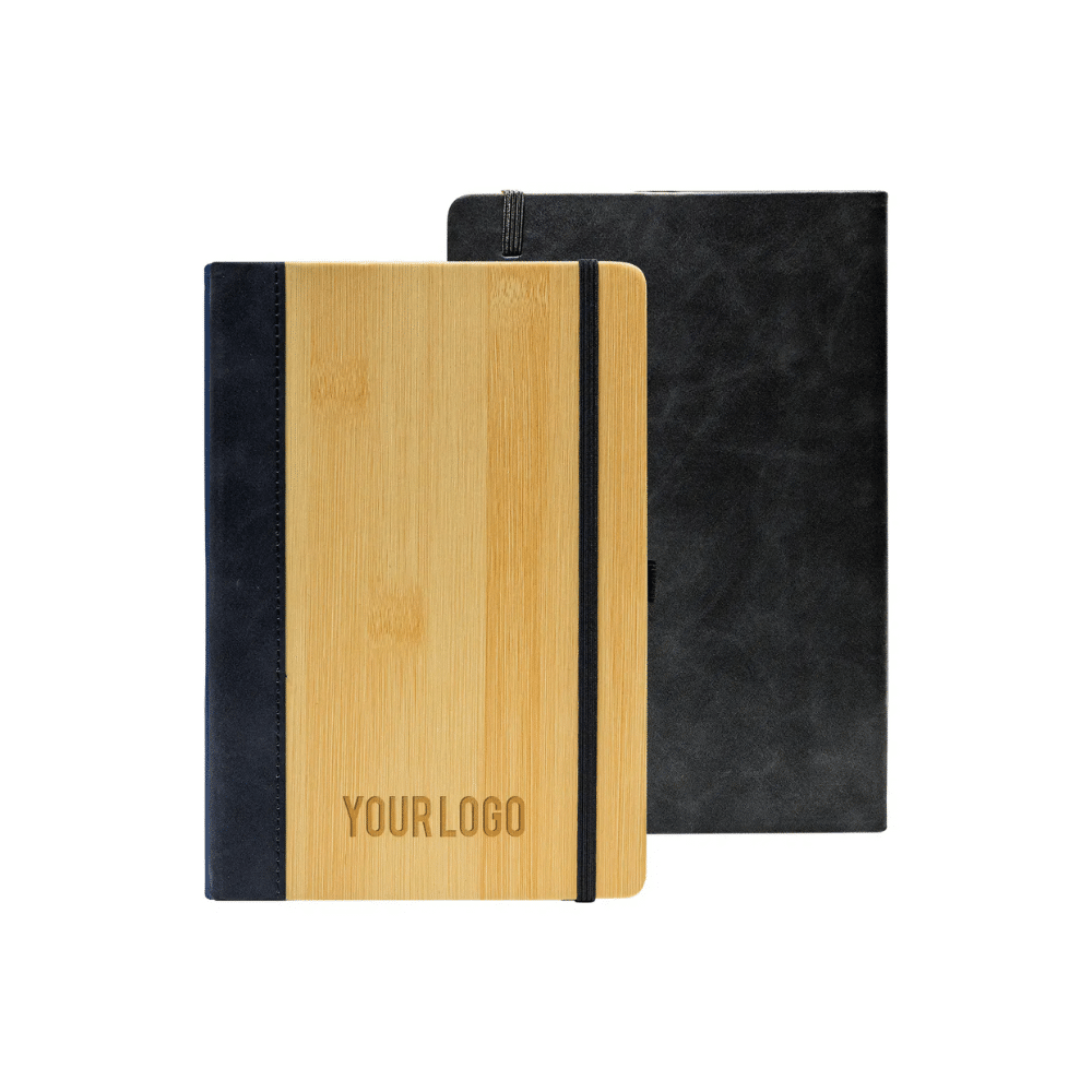 The Custom Branded Verde Leather & Bamboo A5 Notebook by Merchlist perfectly combines eco-conscious craftsmanship with timeless elegance. It is the ideal custom printed corporate gifting product for brands that value sustainability and sophistication. Expertly designed with a bamboo finish front cover and a textured PU leather back and spine, this notebook offers a harmonious balance.
