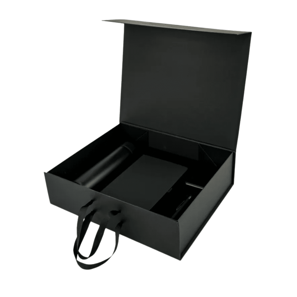 • luxury foldable gift box with magnetic closure and ribbon handle.