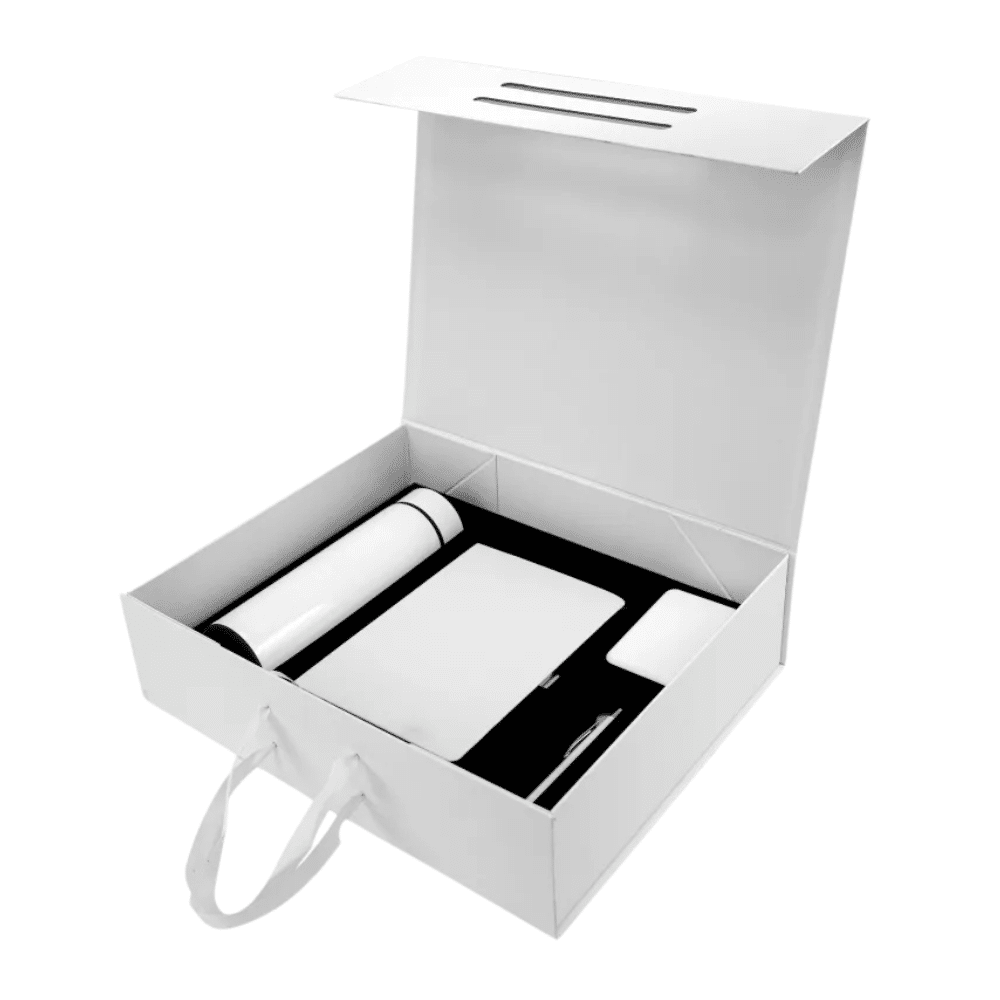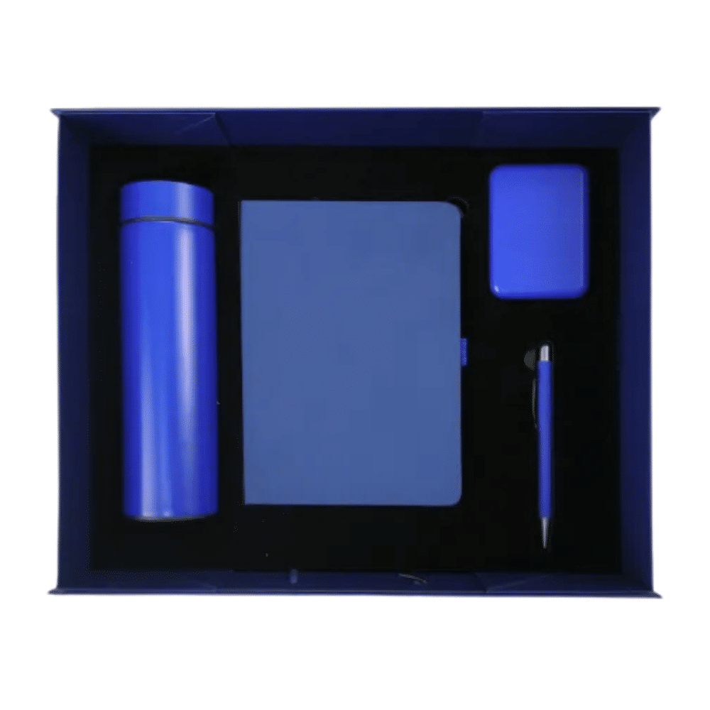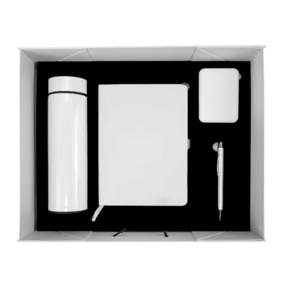 Presented in a luxury foldable cardboard gift box with magnetic closure and ribbon handle, the set includes a notebook, pen, bottle, and power bank. Each item is carefully placed in a cushioned interior for protection and an elevated unboxing experience.
