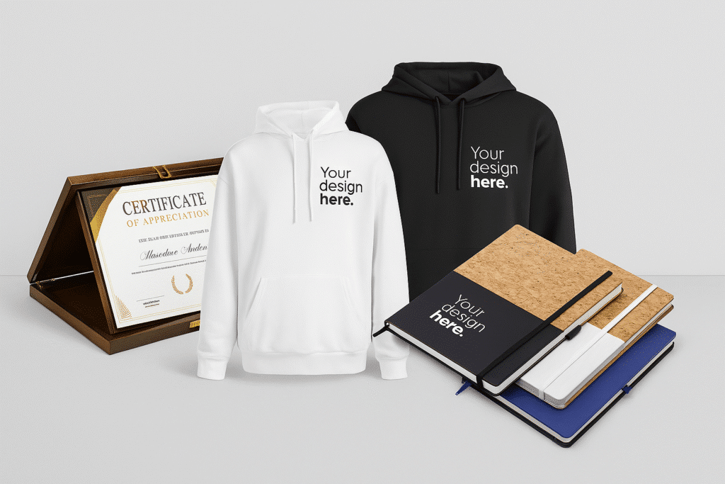 Consider functional gifts employees can use every day while subtly showcasing your brand. Options include branded mugs, notebooks, USB drives, planners, or office gadgets. These items reinforce recognition while keeping your brand top-of-mind.